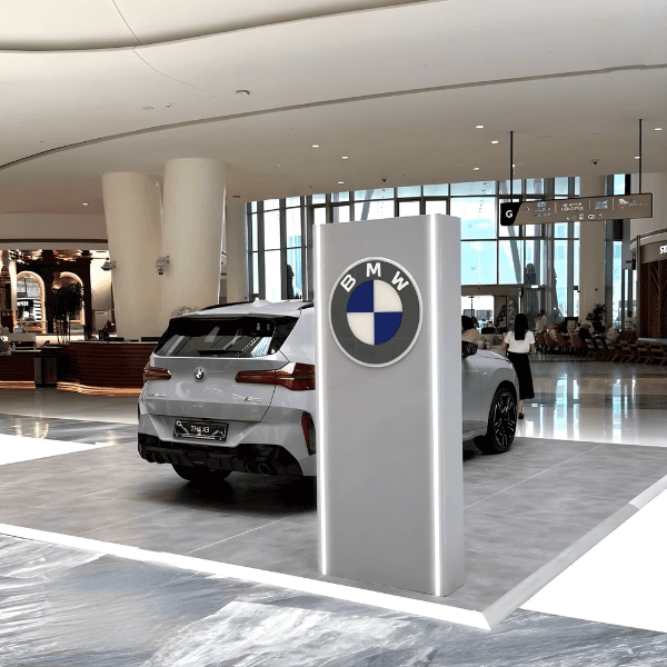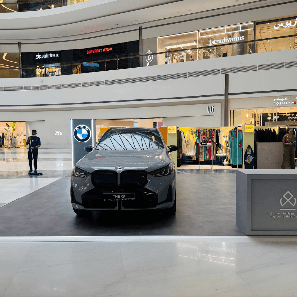 Event production setup for BMW Al Ghanim at Al Samia Mall, structured to support brand presentation, audience flow, and high-visibility display requirements.